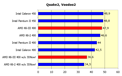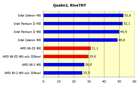 Результаты, конечно, не такие радужные, как при использовании синтетического теста CPU 3DMark, но, тем не менее, K6-III ведет себя достойно. Производительность K6-III 400 со включенным 3DNow! оказывается на уровне Intel Pentium II 450. Но при отключении этого блока, число fps падает практически в полтора раза и никакой конкуренции не получается.