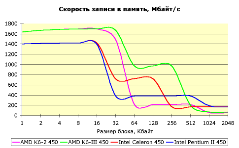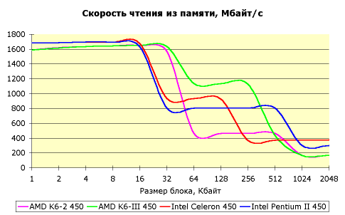 Первым делом, что нам захотелось проверить, это скорость работы с кэш-памятью различных уровней и с системной памятью. Для этого были испытаны 4 разных процессора AMD K6-2, AMD K6-III, Intel Celeron и Intel Pentium II, работающие на одинаковой частоте — 450 МГц (100 х 4.5). Результаты получились очень любопытными: