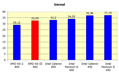Посмотрим теперь, какова производительность K6-III в Unreal — самой "тяжелой" для CPU игре последнего времени, не имеющей глубокой оптимизации под 3DNow!.