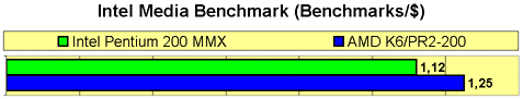 Здесь Pentium показал более высокие результаты в абсолютном измерении. Но характеристика Bench на $ у K6 выше: