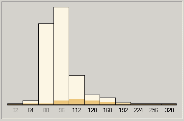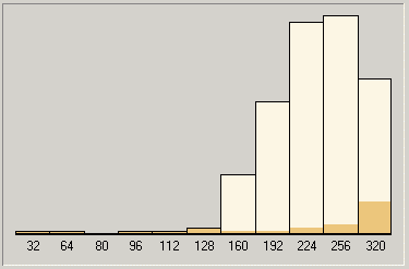 В общем-то, ничего особенного. Вполне вписывается в наши гипотезы. Для справки (и чтобы вы не подумали, что наши выводы относительно специфики работы параметра V в кодеке LAME чисто умозрительны) мы приведем гистограммы кодирования MP3 с переменным битрейтом для большого диапазона и разного качества VBR (благо, RazorLame выводит их в весьма понятной и доступной форме). Четко видно, как меняется «весовой состав битрейтов» в итоговом MP3 при сохранении одного и того же диапазона, но разном значении параметра V.