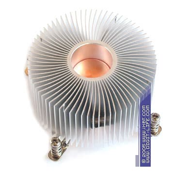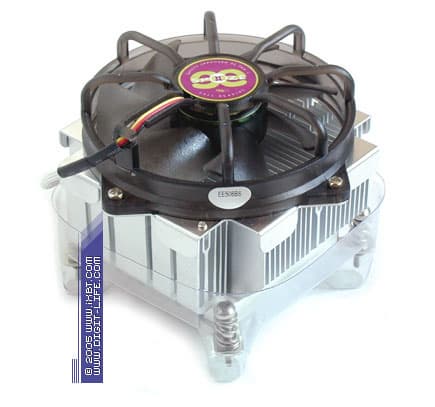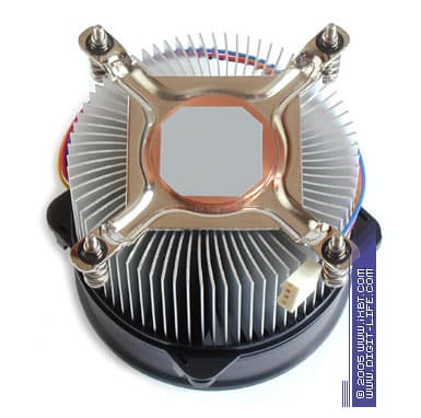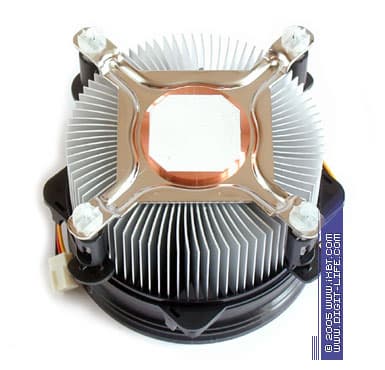 Несколько видоизменился в серии CI5-9JD3A и сам радиатор, получив более укрупненные габариты (90х45 мм против 90х37 мм у CI5-9HDPA) и потяжелевший вес (530 г против 460 г у серии CI5-9HDPA). И хотя новые параметры оребрения получились скорее упрощенными, чем улучшенными (72 ребра со средней толщиной 0,8 мм), одновременно с этим был увеличен шаг размещения ребра (что естественным образом уменьшает гидравлическое сопротивление радиатора и облегчает его продуваемость), возросла также и общая площадь поверхности теплообмена (которая составляет здесь около 2000 см2). Определенно, все это должно самым позитивным образом сказаться на улучшении термических характеристик CI5-9JD3A.