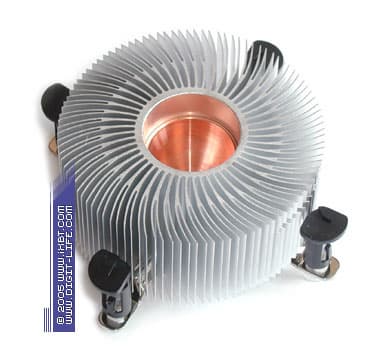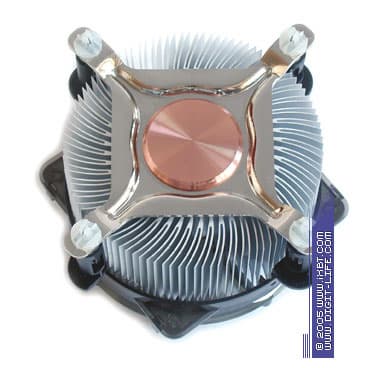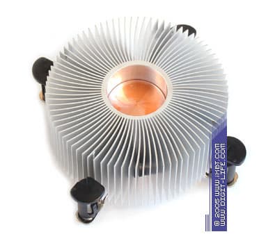 Пожалуй, главная достопримечательность серии CI5-9HDPA — это комбинированная медно-алюминиевая конструкция радиатора, которая облагорожена медным сердечником 30х29 мм (диаметр пятки 38 мм), запрессованным в основание оребрения. Технические параметры собственно самого оребрения также вполне пристойные: радиатор насчитывает 84 ребра толщиной в среднем 0,6 мм и шагом 0,8 мм в основании, общая площадь поверхности теплообмена составляет около 1850 см2.