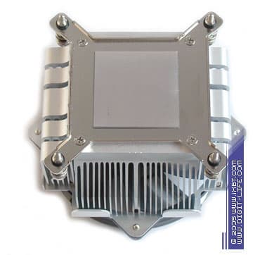 Основной допинг модернизации принял радиатор Igloo 5071 — он изменился не только по форме, но и, в значительной степени, по содержанию. Главное приобретение здесь — гораздо более развитая конфигурация с уплотненным оребрением, сдобренная традиционными катализаторами тепловой эффективности в лице ребра трапецеидального сечения (толщина 0,5 мм в основании и 0,2 мм у вершины, средний шаг ребра 1,5 мм) и чередования высоты ребра, которые призваны усилить термическую эффективность оребрения и улучшить его продуваемость. Усовершенствованию подверглась и подошва радиатора — она получила специализированный вырез-пятку 60х32х5 мм, что позволило оптимизировать условия теплосъема с процессора без применения волнообразных утолщений и сделать радиатор более компактным. В итоге, за счет улучшенных параметров оребрения, радиатор Igloo 5071 развил общую площадь поверхности теплообмена до 2100 см2 (против 1600 см2 у Igloo 5070), при этом масса кулера не увеличилась, а даже уменьшилась почти на 100 г (440 г против 530 г у Igloo 5070).