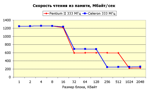 Благодаря увеличению частоты кеша, новые Celeronы, хоть и обладают кешем меньшего размера, чем Pentium II, с блоками памяти небольшого размера (до 128 Кбайт) работают быстрее. Мы померили скорость операций с памятью для обоих процессоров при работе на частоте 333 МГц:
