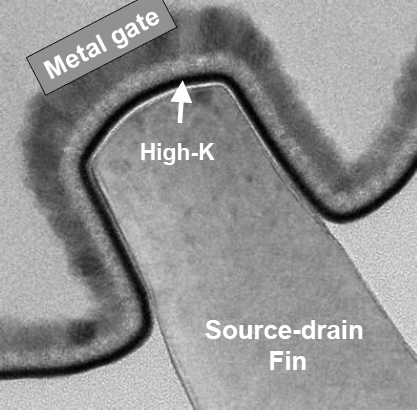 ![]() Сечение канала-плавника в образце 2006 г. с первой версией технологии HKMG. |