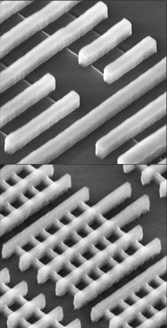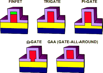 ![]() Вверху показаны 32-нанометровые планарные транзисторы, внизу — 22-нанометровые 2- (в левом нижнем углу) и 6-затворные «трёхмерные». |