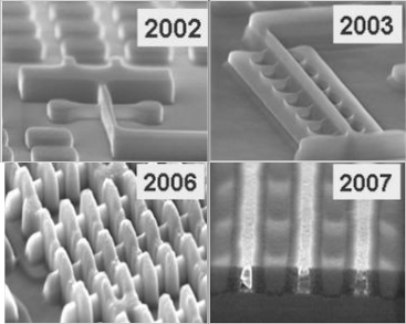![]() 4 поколения «плавниковых» транзисторов Intel — демонстрация конструкции (2002 г.), многозатворность (2003), ячейки СОЗУ (2006) и адаптация металлического «затвора последним» (2007). |