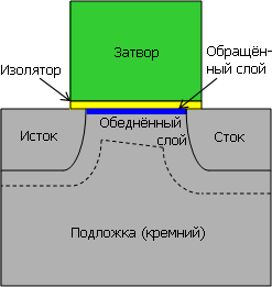 ![]() Транзистор на цельной подложке (какую до сих пор использует Intel) имеет утечку тока из канала, когда в нём полем затвора формируется обращённый слой. Подложка (даже если она заземлена) вытягивает часть носителей заряда в обеднённый слой. ▼ |