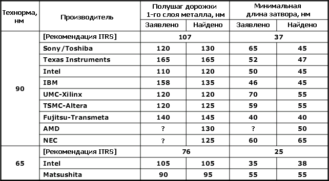 ![]() Рекомендации ITRS для логики в 2003 г. в сравнении с фактически найденными параметрами фирмой Chipworks, специализирующейся на «инженерной разборке» микросхем. |