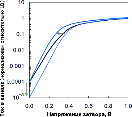 Вольтамперные характеристики (ВАХ) планарного (чёрная линия) и двух трёхмерных (синие) n-канальных транзисторов. Ток при нуле на затворе в идеале должен быть нулевым. Чем он меньше — тем меньше потребляет процессор, в т. ч. при простое. Пороговое напряжение — такое, при котором транзистор переключается (в данном случае — 0,33 В с током в 10% от номинала). Оно должно быть как можно меньше, чтобы транзистор срабатывал быстрее и при меньшем напряжении питания (тут — 1 В). Переход на трёхмерный затвор позволяет либо при том же напряжении уменьшить утечку при закрытом канале (нижняя линия), либо увеличить скорость его открытия (верхняя линия), заодно снизив напряжение. | |