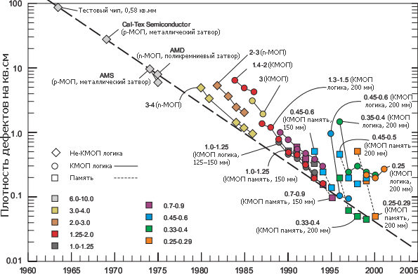 ![]() Плотность дефектов на 1 см² площади кристалла от наиболее продвинутых фабов при финальном тестировании. Жирными цифрами указана технорма в микронах, в скобках — диаметр пластин. | ||||||||||||||||||||||||||||||||||||||||||||||||||||||||||||||||||||||||||||||||||||||||||||||||||||||||||||||||||||||||||||||||||||||||||||||||||||||||||||||||||||||