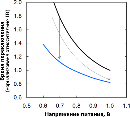 Зависимость времени переключения от напряжения питания (в идеале — гипербола) для 32-нанометровых (чёрная линия) и 22-нанометровых (серая) планарных, а также 22-нанометровых объёмного (синяя) транзисторов. Последний позволяет при той же скорости снизить напряжение питания на 0,2 В, что в теории уменьшит потребление в 1,56 раза, а по мнению Intel — более чем вдвое. Если же требуется повысить частоту, новые транзисторы принесут небольшую пользу при номинальном одном вольте (обещано ускорение на 18% относительно 32 нм), зато при 0,7 В (видимо, таково будет напряжение для мобильных чипов) дадут аж 37-процентное ускорение. Более того, если судить по этим графикам из презентации, то ускорения будут на 22% и 59% — т. е. 1/(1−0,18) и 1/(1−0,37), как и следует считать. Неужели мы застукали технарей Intel на элементарных ошибках при расчётах с процентами?.. |
