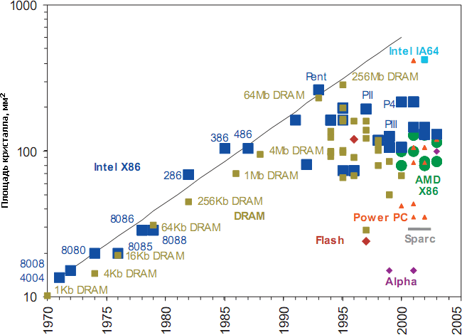 ![]() Площади кристаллов наиболее сложных микросхем процессоров и памяти на указанный год. В 1990-е годы тенденция увеличения площади на 14% в год (чёрная линия) остановлена. Впрочем, самые сложные кристаллы ГП и серверных ЦП достигают 400–500 мм², но и эта цифра не растёт уже лет пять, хотя почти все производители уже успели с 90-х перейти на 300-миллиметровые пластины, позволяющие производить с той же массовостью и ценой даже такие большие кристаллы. | ||||||||||||||||||||||||||||||||||||||||||||||||||||||||||||||||||||||||||||||||||||||||||||||||||||||||||||||||||||||||||||||||||||||||||||||||||||||||||||||||||||||