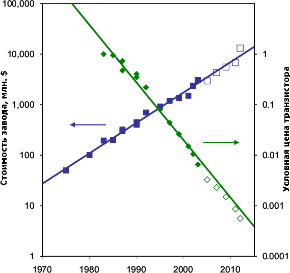 ![]() Стоимость постройки наиболее современного на указанный год завода (или его стоимость после обновления) возросла в 70 раз за 30 лет, а цена каждого выпускаемого ими транзистора упала в 2000 раз. Пустые квадраты означают примерные цифры. Тут не хватает графика производственной мощности, но надёжных данных по ней на весь период нет. Впрочем, известно, что современные фабы выпускают от 10 до 60 тыс. пластин в месяц в случае логики и ещё в 2–3 раза больше для памяти. Выпуск пластин удваивается примерно каждые 5 лет, помимо увеличения их диаметра. А «удвоение стоимости фаба каждые 4 года» даже было названо «вторым законом Мура» (иначе — законом Рока, Rock’s law), который в конце 90-х также пришлось поправить — каждые 5 лет. Наиболее дорогой станок — фотолитограф — дорожает с такой же скоростью: первый коммерческий проекционный степпер (1973 г.) стоил 210 тыс. долларов, а современный сканер — 40–50 млн.. | ||||||||||||||||||||||||||||||||||||||||||||||||||||||||||||||||||||||||||||||||||||||||||||||||||||||||||||||||||||||||||||||||||||||||||||||||||||||||||||||||||||||