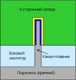 ![]() «Трёхзатворный» транзистор на деле означает транзистор с каналом, окружённым затвором (через прослойку в виде тонкого изолятора, обозначенного жёлтым) с трёх сторон — по сравнению с планарным, где поверхность сопряжения представляет собой одну плоскость. |