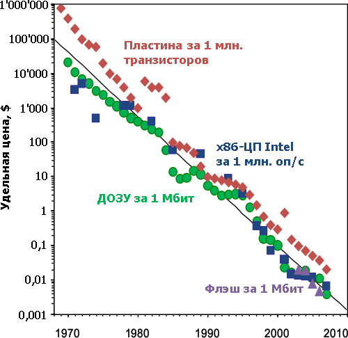 ![]() Удельные цены пластины и разных видов микросхем за единицу их наиболее ценных количественных характеристик. Чёрная линия указывает ежегодное падение средней цены на 35% или в 1,54 раза. Больше возможностей за ту же цену чипов позволяли расти продажам микросхем на 15% в год с 1960 по 2000 гг.. Однако лопнул пузырь доткомов, а через 8 лет грянул мировой кризис, что прекратило рост продаж (но не параметров). В 2010-х за счёт популярности смартфонов и планшетников возможен рост примерно на 5% в год, если, конечно, опять что-то не стрясётся… | ||||||||||||||||||||||||||||||||||||||||||||||||||||||||||||||||||||||||||||||||||||||||||||||||||||||||||||||||||||||||||||||||||||||||||||||||||||||||||||||||||||||