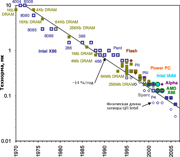 Данные с IC Knowledge, если не указано иное. ![]() Технорма наиболее сложных микросхем. Падает также их цена — правда, не вдвое (исходя из примерно половинной площади чипа для данного числа транзисторов — за исключением последних техпроцессов…), а примерно в 1,5 раза при каждом переходе на очередной техпроцесс (т. к. он сложнее и дороже на каждую единицу площади). По какой причине физическая длина затвора (не только для ЦП Intel) оказывается меньше технормы — читайте ниже. | ||||||||||||||||||||||||||||||||||||||||||||||||||||||||||||||||||||||||||||||||||||||||||||||||||||||||||||||||||||||||||||||||||||||||||||||||||||||||||||||||||||||