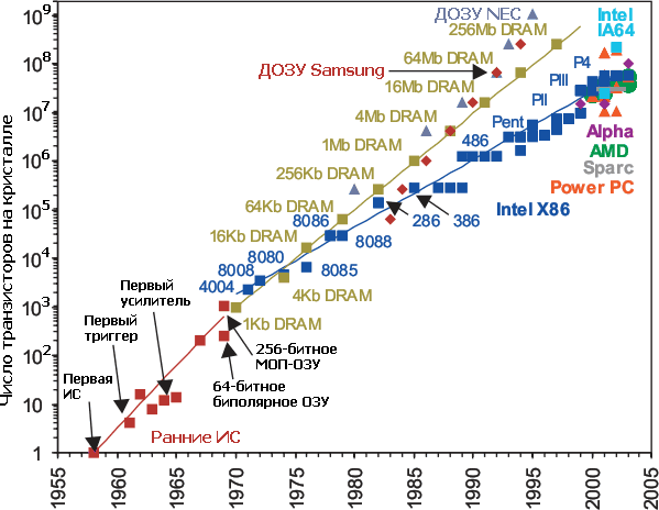 ![]() Число транзисторов на кристалле ИС как следствие уменьшения технормы и увеличения площади кристалла. Видно, что первоначальная тенденция 2-кратного роста в год, по которой строил свои рассуждения Гордон Мур, была в прямом смысле весьма крутой. Но с 70-х и микросхемы ДОЗУ (теперь — и флэша), и процессоры продолжили её с меньшими темпами — 58% и 38% в год. | ||||||||||||||||||||||||||||||||||||||||||||||||||||||||||||||||||||||||||||||||||||||||||||||||||||||||||||||||||||||||||||||||||||||||||||||||||||||||||||||||||||||