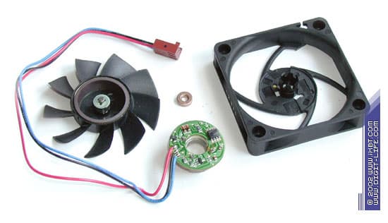 В обычных вентиляторах на комбинированных подшипниках (подшипник качения плюс подшипник скольжения) нагрузку (вал с крыльчаткой) воспринимают оба подшипника, а стопорная шайба ставится позади подшипника скольжения. Конструкторы малогабаритных вентиляторов Delta поступают иначе: вал крыльчатки здесь немного укорочен, а стопорная шайба вместе с тонким резиновым сальником ставится между подшипником качения и подшипником скольжения. В результате надежность вентилятора повышается, поскольку слабый подшипник скольжения оказывается почти полностью разгруженным и даже в случае серьезных повреждений не сможет заклинить вал крыльчатки. На такой вентилятор можно смело положиться, он не подведет в трудную минуту.