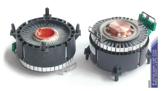Однако при более близком контакте начинают открываться весьма интересные детали, и первое не слишком благоприятное впечатление рассеивается как дым. Главная достопримечательность радиаторов серии 37256 — новая фирменная технология изготовления с громогласным наименованием Stamped Fin, на разработку которой Molex потратила немало времени и сил. И хотя эти радиаторы во многом похожи на изделия, построенные по «древней», но в меру продвинутой технологии bonded fin (тонким алюминиевым или медным оребрением, напаянным на медную подошву, нынче никого уже не удивишь), их конструктивное исполнение имеет серьезное отличие. В радиаторах bonded fin оребрение просто напаивается на поверхность подошвы, чем обеспечивается прочное сцепление и неплохой термический контакт. В радиаторах stamped fin от Molex дело обстоит гораздо сложнее: здесь пластины оребрения (толщиной всего около 0,3 мм) как бы «забиваются» в подошву и «сшиваются» с ней комплексным техпроцессом, представляющим некий симбиоз контактной сварки и поверхностной пайки.