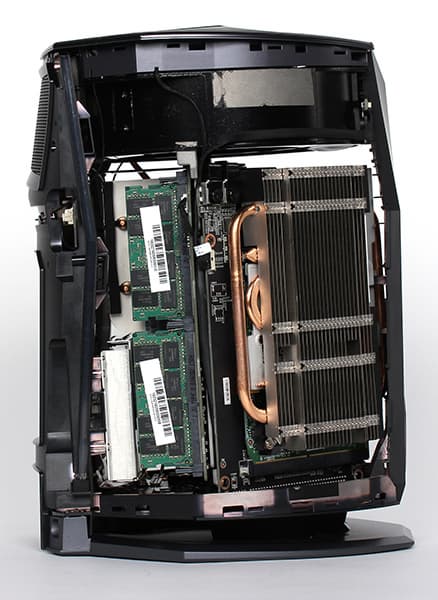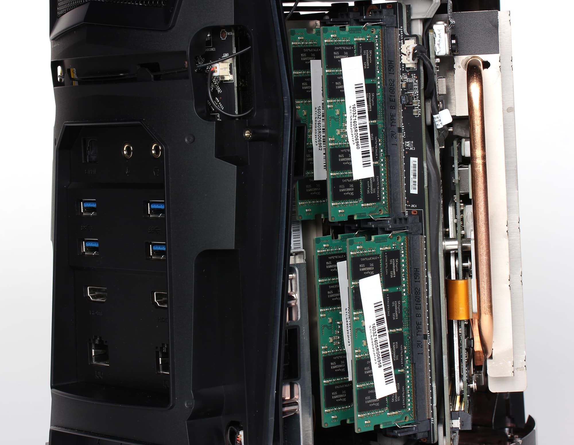 Сняв же боковые панели и верхнюю панель корпуса, можно получить доступ к четырем модулям памяти, HDD и одному SSD (напомним, что в компьютере установлено два SSD, но доступ можно получить только к одному). Именно эти компоненты можно легко заменить при необходимости.