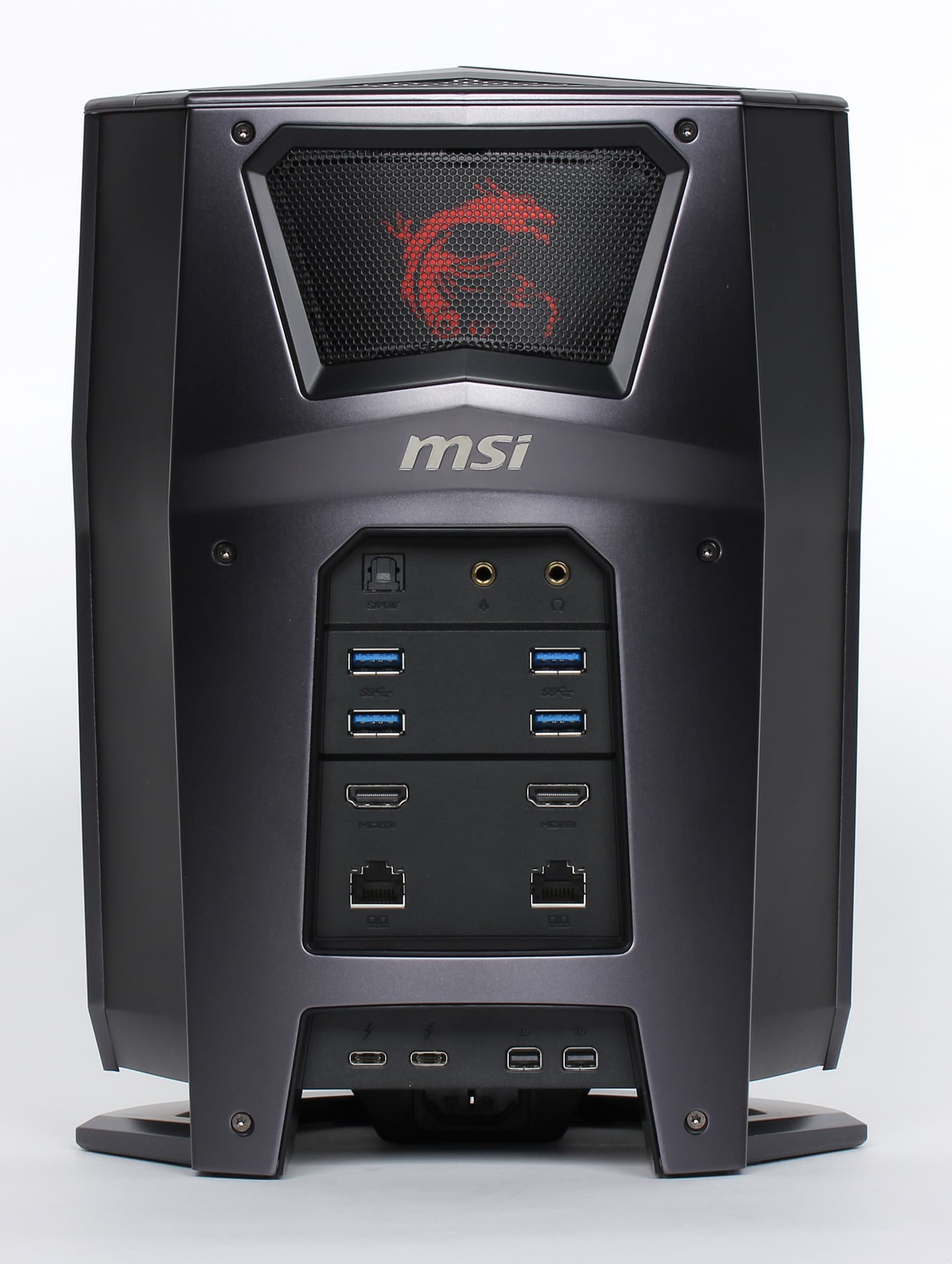 На передней панели корпуса (хотя, конечно, при такой форме корпуса разделение на заднюю, переднюю и боковые панели весьма условно) имеется традиционный логотип игровой серии MSI и кнопка включения питания. Причем если не знать, что это кнопка, то догадаться об этом непросто: она выглядит как моддинговая вставка. При включении компьютера эта кнопка начинает светиться. Есть на передней панели и еще две моддинговые вставки в виде вертикальных полос с изломом, которые также светятся во время работы компьютера, причем цветом этой подсветки можно управлять, настроив с помощью фирменной утилиты MSI цвет по своему вкусу.