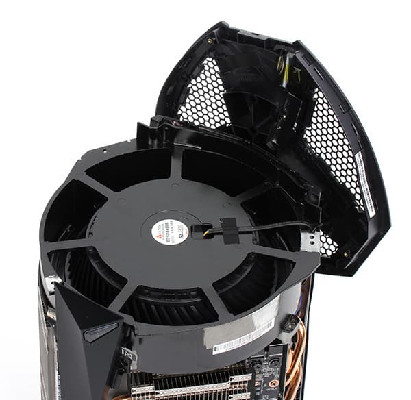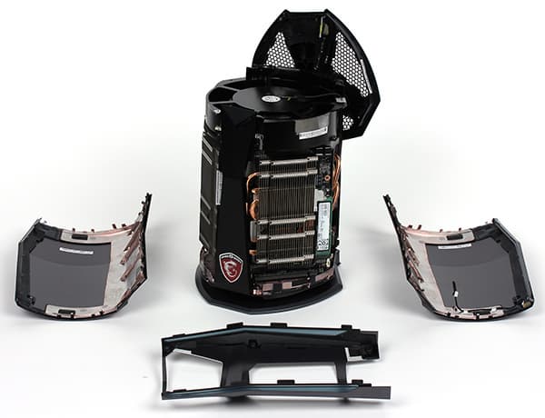 Сама идея создания производительного компьютера с двумя видеокартами в компактном корпусе цилиндрического типа не нова. Пионером в этом была компания Apple со своим Mac Pro. В MSI Vortex G65 применяется аналогичный цилиндрический корпус, выполняющий функцию воздуховода, а турбинный вентилятор, установленный в верхней части корпуса, засасывает воздух через вентиляционные отверстия в нижней части корпуса и прогоняет его сквозь ребра радиаторов тепловыделяющих компонентов. Системная плата разделена на несколько частей, связанных друг с другом шлейфами. Однако нельзя сказать, что MSI Vortex G65 является копией Mac Pro. И дело не только в том, что у них абсолютно различная конфигурация, но и в том, что в MSI Vortex G65 немного иначе реализована система охлаждения. В Mac Pro используется лишь один вентилятор и один радиатор призматического типа, каждая сторона которого соприкасается с тепловыделяющими компонентами. А в MSI Vortex G65 у видеокарт свои отдельные радиаторы, а у процессора не только отдельный радиатор, но еще и свой вентилятор. Причем, забегая вперед, если Mac Pro практически бесшумный, то MSI Vortex G65 6QF SLI устанавливает своеобразный рекорд по уровню шума: более шумного ПК нам еще видеть не доводилось.