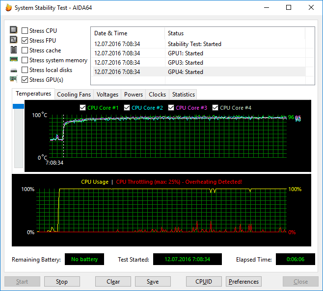 При загрузке процессора тестом Stress CPU (утилитой AIDA64 Extreme Edition — тест на стабильность системы), который использует целочисленные вычисления, частота процессора составляет 4,0 ГГц (напомним, что для процессора Intel Core i7-6700K максимальная частота в режиме Intel Turbo Boost составляет 4,2 ГГц). Температура процессора в этом режиме загрузки увеличивается до 73 °С.