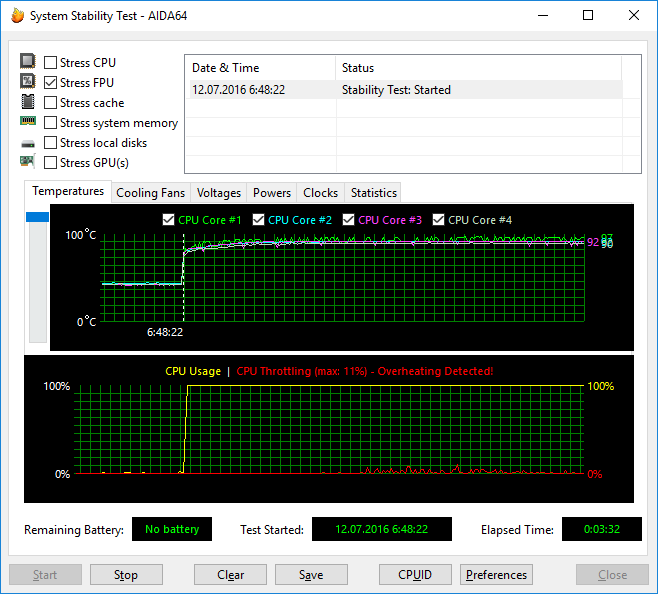 При нагрузке процессора тестом Stress FPU, который использует вычисления c плавающей запятой и в большей степени нагревает процессор, температура ядер процессора увеличивается до 97 °С, но частота ядер процессора не меняется и составляет 4,0 ГГц.