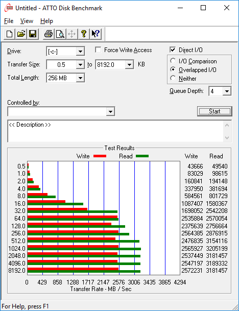 И действительно, утилита ATTO Disk Benchmark определяет максимальную скорость последовательного чтения на уровне 3,2 ГБ/c, а скорость последовательной записи — на уровне 2,5 ГБ/с.