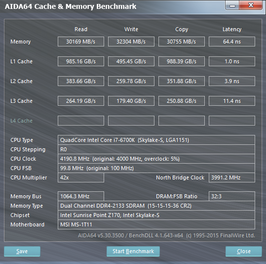 Согласно данным утилиты AIDA64 Cache & Memory Benchmark, скорость записи данных в память составляет 32304 МБ/с, а скорость чтения — 30169 МБ/с. Для памяти DDR4-2133 в двухканальном режиме работы это типичный результат.