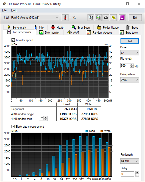 Как видим, производительность RAID-массива из двух NVMe-накопителей в компьютере MSI Vortex G65 6QF SLI является не просто высокой, а рекордно высокой. Для сравнения укажем, что по скорости такой RAID-массив превосходит показатели типичного SSD-накопителя с интерфейсом SATA в 5 раз и типичного HDD более чем в 10 раз.