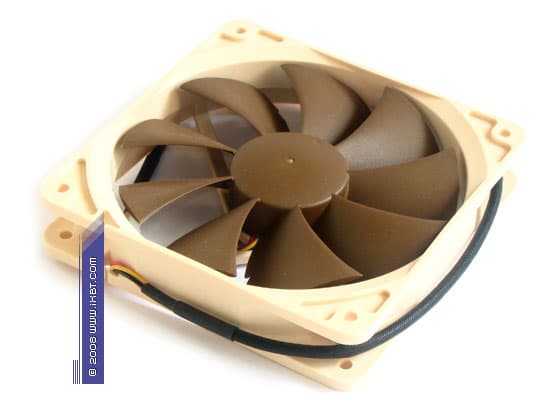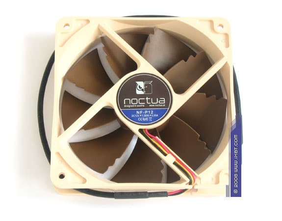 Не менее интересным и, пожалуй, даже в чем-то уникальным оказывается также конструктив комплектного вентилятора (артикул NF-P12), главной достопримечательностью которого выступают специализированные треугольные вырезы на задней кромке лопастей крыльчатки (именуемые Vortex Control Notches в терминах Noctua). Хотя в этом инженерном решении и присутствует некоторая доля, скажем так, маркетинга, его «акустический» рационализм вряд ли можно оспорить: «зубцы» на задней кромке лопасти позволяют оптимизировать вихреобразование (они как раз и расположены в самой «вихреактивной» зоне, в непосредственной близости к внешней кромке лопасти и вентиляторному патрубку), частично нейтрализуя так называемый «гул крыльчатки», и дополнительно сгладить вредные эффекты шумового взаимодействия лопастей крыльчатки и стоек статора. Не исключено, что зубцы опосредованно влияют и на расходную характеристику, особенно в режимах средних или высоких скоростей вращения крыльчатки.
