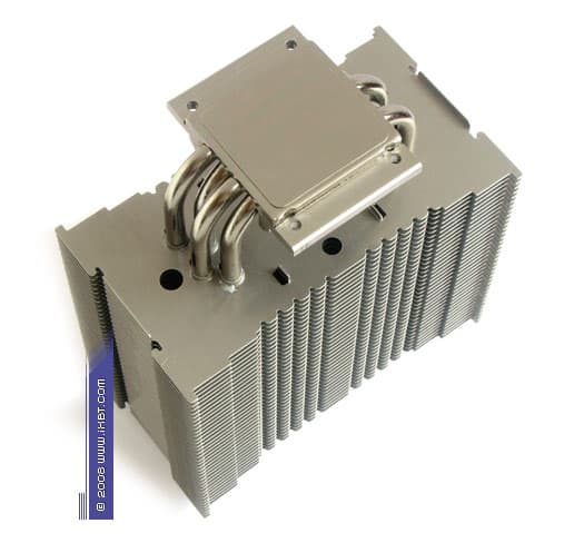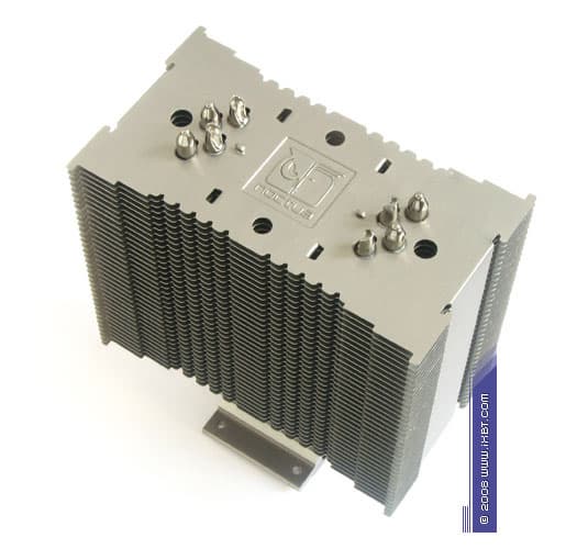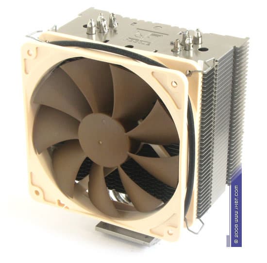 Как и подобает серьезному продукту высшего класса, «новичок» NH-U12P эффектно и с тонким, можно даже сказать, аристократическим шиком совмещает харизматичную внешность и развитое внутреннее содержание. Действительно, кулер впечатляет — его «рабочее тело» образовано солидной комбинацией из медного теплосъемника 45×42×5 мм, четырех медных тепловых трубок диаметра 6 мм и крупногабаритного алюминиевого оребрения (эффективные размеры 126×72×105 мм), которую дополняет симпатичный комплектный вентилятор типоразмера 120×120×25 мм с номинальной скоростью вращения крыльчатки 1300 об/мин.