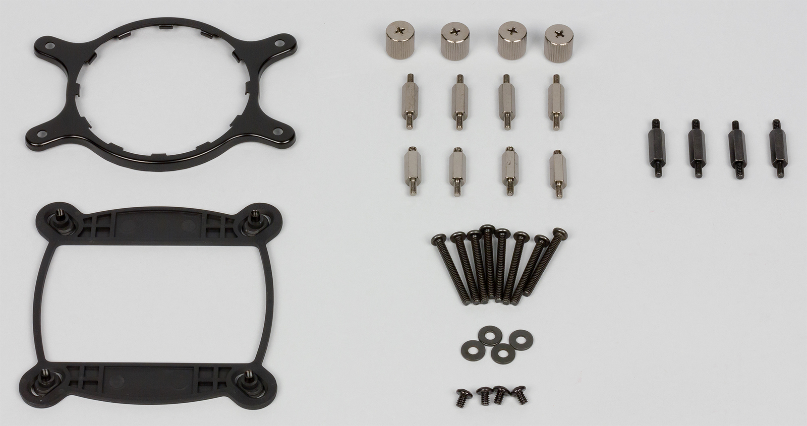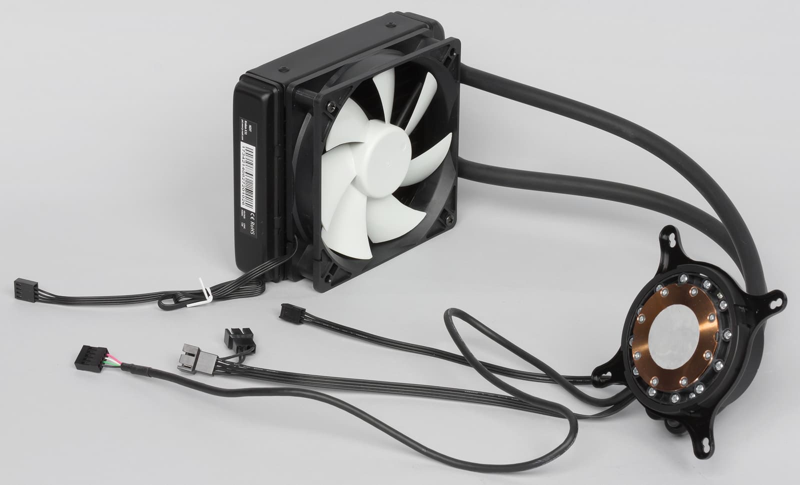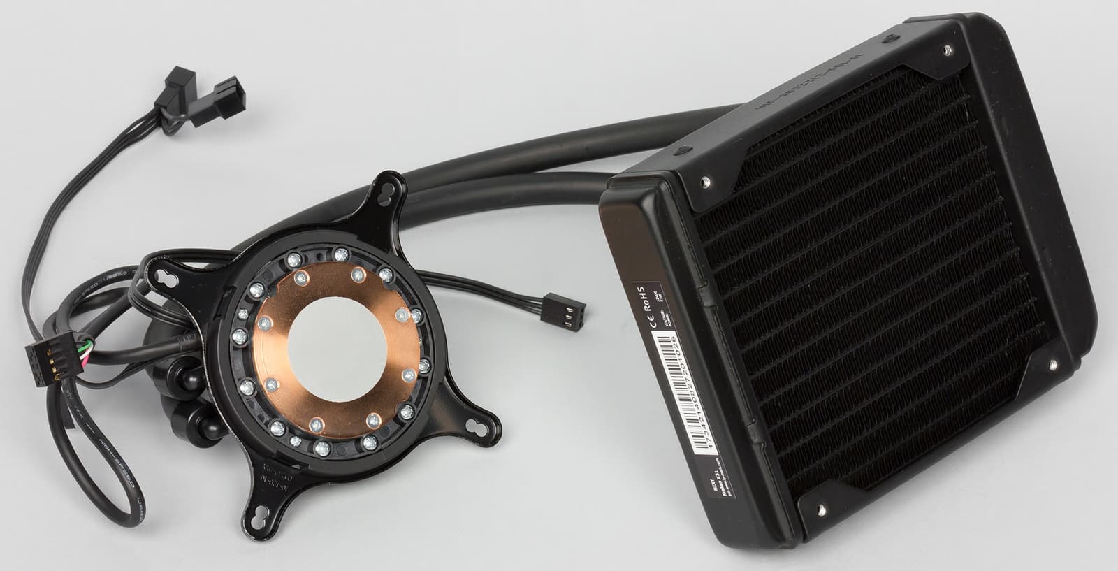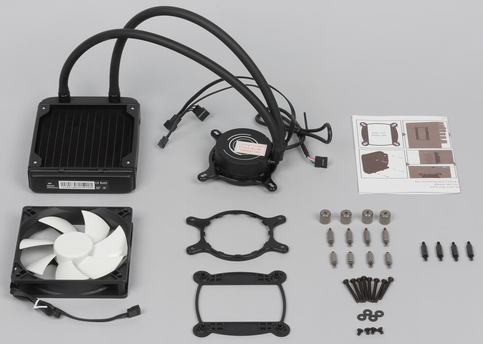 Внутри располагаются все основные компоненты этой модели, включая помпу, радиатор охлаждения, вентилятор и системы крепления под разные процессорные разъемы. В комплект поставки входит все необходимое для крепежа системы на все основные процессорные разъемы Intel и AMD. Для платформ Intel поддерживаются разъемы LGA 775, LGA 1150, LGA 1155, LGA 1156, LGA 1366, LGA 2011 и LGA 2011-v3, а для AMD — AM2, AM2+, AM3, AM3+, FM1, FM2 и FM2+. Комплектация достаточна для быстрого подключения системы к ПК. Отдельного тюбика с термопастой здесь нет, однако сама термопаста уже нанесена на основание помпы. Помпа подключается к системной плате с помощью 3-контактного разъема и управляется так, как будто к компьютеру подключен обычный вентилятор (если в системе не установлено фирменное ПО).