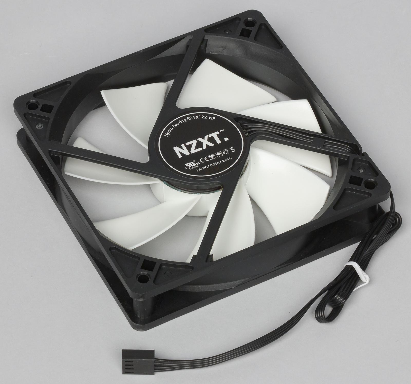 В комплекте с NZXT Kraken X31 поставляется один фирменный вентилятор RF-FX122-HP. Эта 7-лопастная модель подключается к основному блоку посредством стандартного 4-контактного разъема и поддерживает ШИМ-управление. Этот тип вентиляторов имеет достаточно широкий диапазон скорости вращения — от 800 до 2000 об/мин и, согласно спецификации, при максимальной скорости вращения создает воздушный поток 81,32 м³/мин, а уровень шума от него достигает 34 дБА.