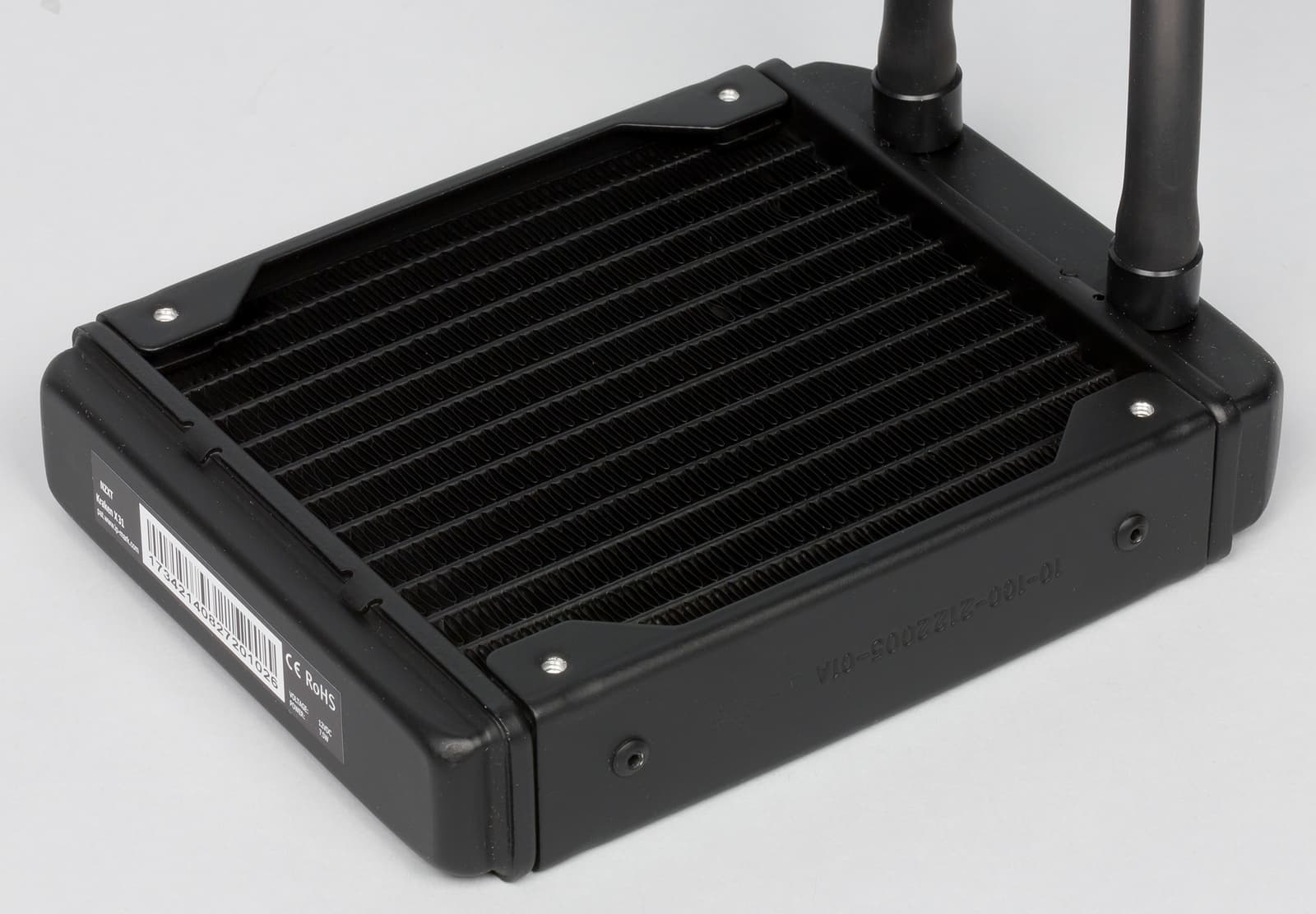 Внешний блок у этой модели не очень большой по размеру, хотя его нельзя назвать слишком уж тонким — он имеет толщину 30 мм (25 мм у рассеивающей части). Длина и ширина блока составляют 155 и 120 мм соответственно. Согласно инструкции, радиаторный блок крепится на стенке корпуса в штатное место. Радиатор Kraken X31 изготовлен из алюминия и покрашен в черный цвет. Он имеет типовую ячеистую структуру, которую можно увидеть во многих моделях СВО, присутствующих на рынке. Крепления для вентиляторов находятся по краям радиатора и предназначены для установки стандартных 120-миллиметровых моделей, располагаемых по обе стороны от радиатора. Отметим, что в комплекте с устройством поставляется только один вентилятор, поэтому дополнительный придется приобретать отдельно. Вентиляторы крепятся к радиатору с помощью специальных винтов и практически полностью покрывают поверхность радиатора, хотя его длина несколько увеличена за счет системы крепления патрубков.