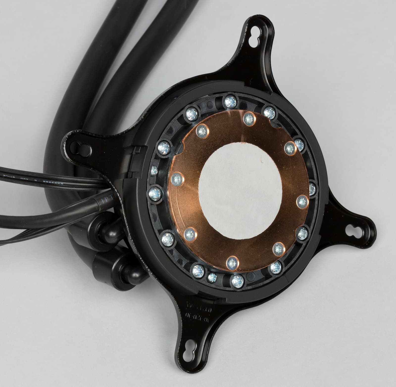 Круглое основание помпы сделано полностью из меди. На основание нанесена термопаста, а по краям можно увидеть целый набор винтов крепления. Сама поверхность основания несколько шершавая и не отшлифована до зеркального блеска. Впрочем, отпечаток на процессоре получается достаточно ровный. Размеры помпы не очень большие, а скорость вращения мотора в ней варьируется от 2400 до 3600 об/мин.