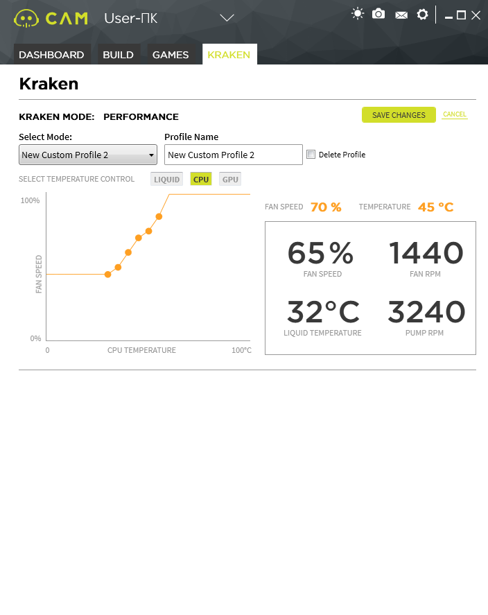 ПО Cam может использоваться совместно с контроллерами вентиляторов Grid+/Grid+ V2 и контроллером RGB-подсветки Hue+. Отметим, что значения скорости вращения как вентилятора, так и помпы, демонстрируемые этой программой, постоянно менялись на большую величину при явно почти неизменных фактических скоростях, а при максимальной нагрузке на ЦП, и когда работала эта программа, временами на несколько секунд переставала реагировать на действия пользователя и обновлять окно как сама программа Cam, так все остальные, работающие параллельно. В итоге в тестах ее мы почти не использовали.