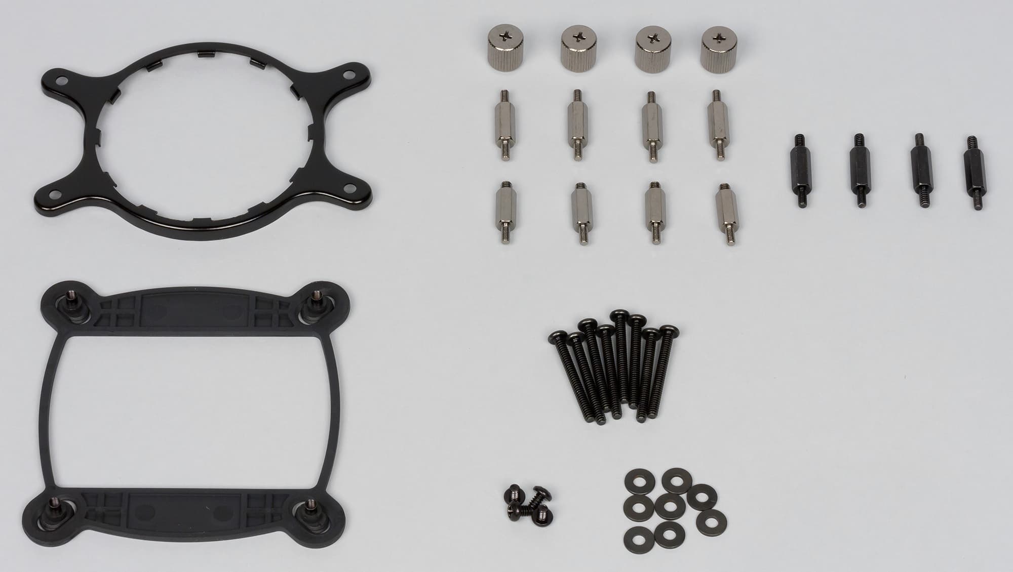 Крепеж изготовлен из закаленной стали и имеет стойкое лакокрасочное или гальваническое покрытие. Исключение — рамка на обратную сторону системной платы, которая изготовлена из пластика, впрочем, резьбовые отверстия в ней все равно в металлических втулках.