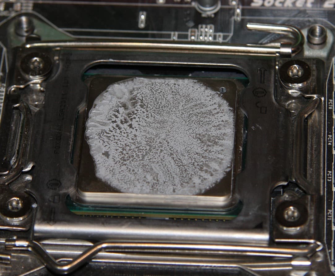 Диаметр этой пластины — 54 мм, а внутренняя часть, ограниченная отверстиями имеет диаметр 43,5 мм. Толщину медной подошвы мы не определили, так как часть ее, возможно, утоплена в корпус помпы. Центральную часть медного основания занимает нанесенная тонким слоем термопаста. Запаса для ее восстановления в комплекте поставки, к сожалению, нет. Забегая вперед, продемонстрируем распределение термопасты после завершения всех тестов. На процессоре: