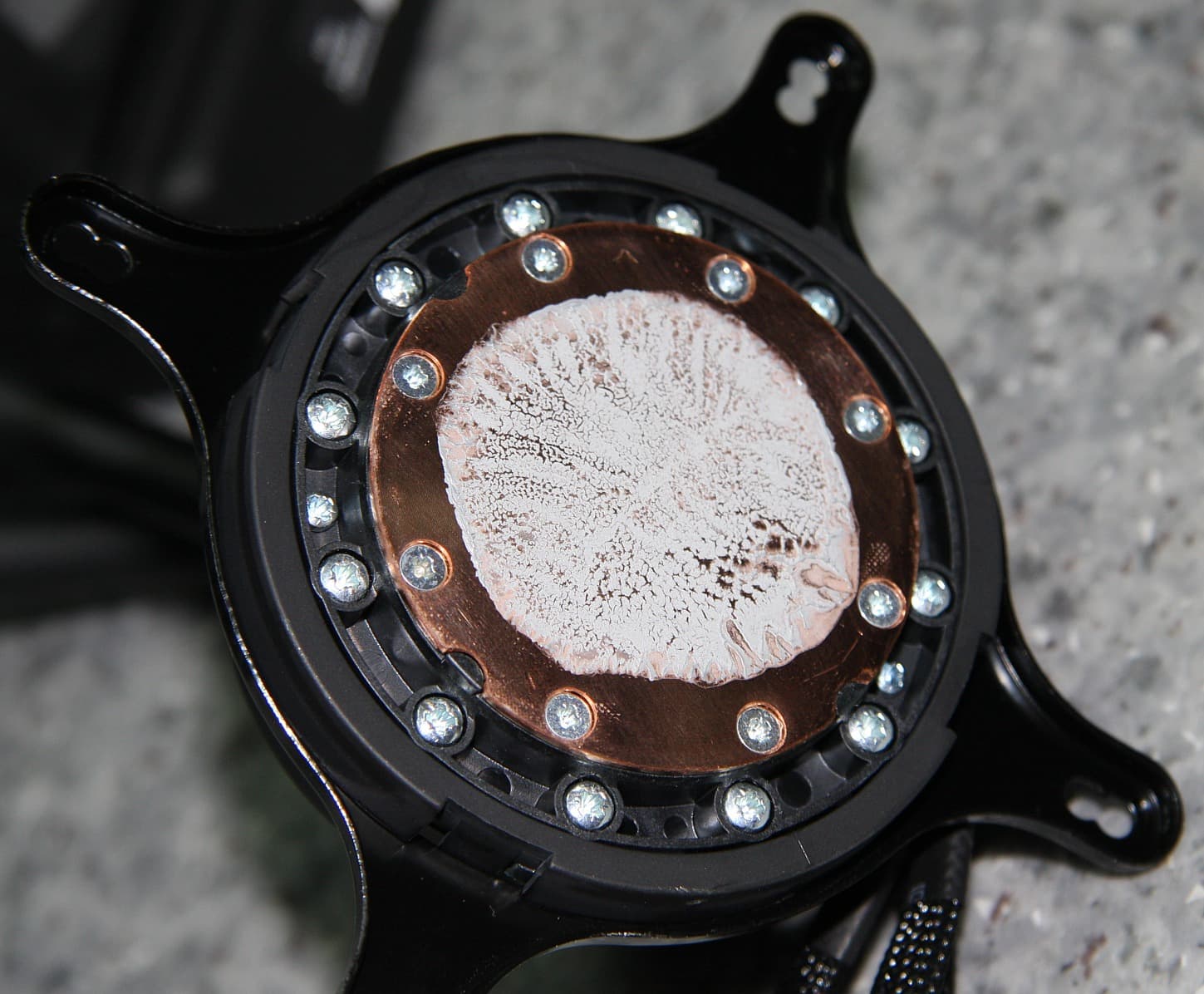 Видно, что термопаста распределилась кругом до краев плоскости крышки процессора, но не попала на углы. Вряд ли это отрицательно сказывается на работе кулера, так как считается, что важнее хорошо охлаждать именно центральную часть крышки процессора. Особо мнительные могут, конечно, чуть добавить термопасты из собственных запасов. На подошве помпы термопаста распределилась почти впритык к отверстиям под винты.