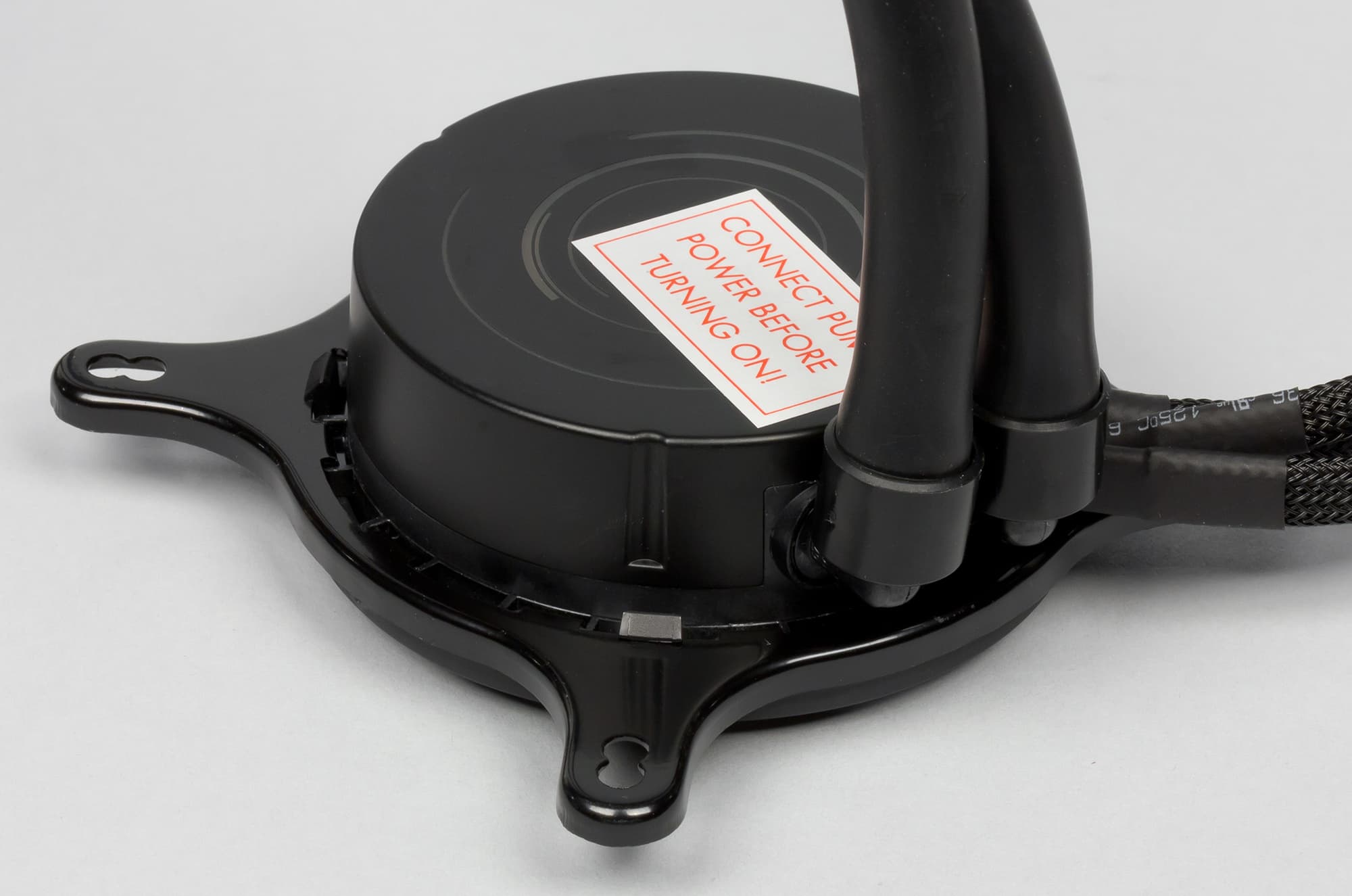 Г-образные штуцеры, выходящие из помпы, можно вращать относительно корпуса самой помпы до того момента, пока они не упрутся в приливы на корпусе помпы. Это, как и гибкие шланги, существенно облегчает установку кулера. Части шлангов, не скрытые гильзами, имеют длину в примерно 380 мм, внешний диаметр шлангов 10,5 мм. Внешние габариты радиатора — 141×177×37 мм при толщине сот примерно 22,5 мм.