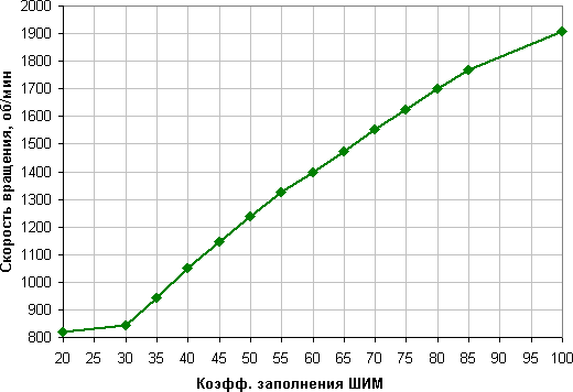 Отличный результат — плавный рост скорости вращения при изменении коэффициента заполнения от 30% до 100%.