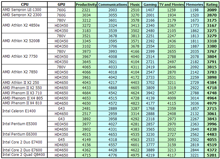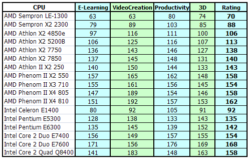 Глядя на этот список, можно предположить минимальную зависимость от установленной видеокарты, важна будет, в первую очередь, собственная производительность процессора. Также на результат повлияет объем и производительность памяти (в наших тестах мы использовали 2 x 1 GB DDR2-1066 AENEON для всех процессоров, за исключением Sempron и Celeron, которым для большего соответствия особо бюджетному сегменту был предоставлен комплект 2 x 512 MB DDR2-800 Kingston). Наконец, еще один компонент, на который следует обратить внимание, - жесткий диск, производительность которого также вносит свой вклад в итоговый балл (и, соответственно, для корректного сравнения разных конфигураций необходимо использовать одинаковые диски).