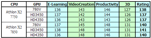 Данная таблица наглядно демонстрирует отсутствие какого-либо влияния установленной видеокарты на результаты теста. И итоговый балл, и результаты в отдельных подтестах, практически не отличаются при использовании как интегрированного в чипсет AMD 780V ядра, так и двух видеокарт на графических процессорах Radeon HD3450 и HD4350.