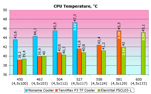 При использовании обычного Noname кулера мы имеем, что даже в номинальном режиме, температура процессора в среднем на 5 градусов выше, чем при использовании более качественных изделий. Поэтому в этом случае уже при достижении частоты 527 МГц дальнейший разгон оказывается невозможен.