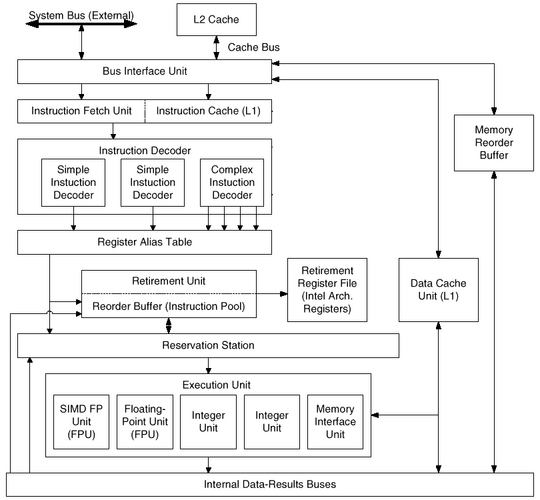 Итак, проведём анализ архитектуры P-III/P-M, чтобы понять, какие изменения могли бы быть в неё внесены для повышения производительности и для реализации характеристик и возможностей новой архитектуры, представленных на форуме IDF.