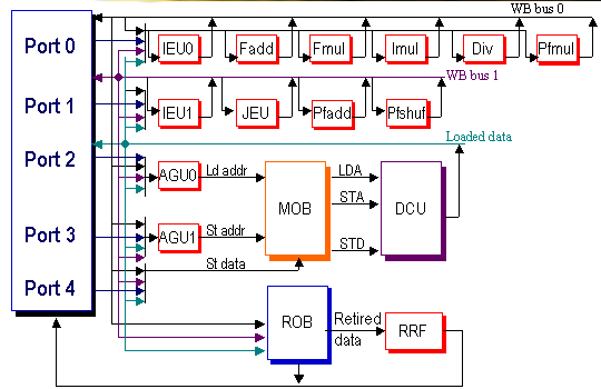 - 3 порта ALU, из них один совмещён с FPmul, и ещё один совмещён с FPadd;